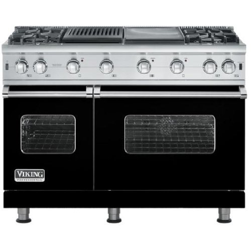 Viking VGCC548-4GQ 48-Inch Professional Series Natural Gas Range With 4 Burners And Grill / Griddle - Stainless Steel. VGCC548-4GQSS. Natural Gas Ranges. Viking knows no limits when it comes to professional quality in the kitchen. The convection oven evenly distributes heat, making it easy to produce professional results. Bake: 30,000 BTUs (Right Oven) / 15,000 BTUs (Left Oven) / Broil (Right Oven Only): 18,000 BTUs. This 48-inch sealed burner range outlasts the competition, making it the last range you will ever need to buy for your kitchen. The convection oven evenly distributes heat, making it easy to produce professional results. Bake: 30,000 BTUs (Right Oven) / 15,000 BTUs (Left Oven) / Broil (Right Oven Only): 18,000 BTUs. This savings-friendly appliance is fueled using clean-burning natural gas. This Viking range with grill and griddle is equipped with an exclusive SureSpark ignition system, promising a spark every time. Viking gas surface burners feature VariSimmer technology which allows you to precisely define ultra-low cooking temperatures. The restaurant-quality, Gourmet-Glo infrared broiler produces intense heat that sears food and locks in juices. Experience baking with the professionals, with the even heat circulation provided by the ProFlow convection baffle system. Four permanently sealed burners, a griddle burner and a grill burner push a powerful 93,000 BTUs and prevent spills that are hard to reach. Stainless steel surface burners endure any cooking trial, and a porcelain oven interior makes oven clean-up easy. Heavy-duty grates provide a virtually continuous work surface. This Viking range sports a sleek stainless steel finish that is the ideal complement for any kitchen. The convection oven evenly distributes heat, making it easy to produce professional results. Bake: 30,000 BTUs (Right Oven) / 15,000 BTUs (Left Oven) / Broil (Right Oven Only): 18,000 BTUs. For your convenience, this range includes island trim.